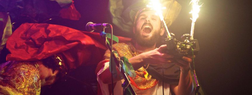 Mae sioe gerddoriaeth seicadelig Affro-Lladin y Flying Swordfish yn cynnwys gwisgoedd yn ogystal â’n Dewin Sawrus! Mae croeso i chi i gyd i “Barti brenhinol ynys drofannol…yn rhedeg drwy’r jyngl amryliw yn eich hoff drywsus aur.”