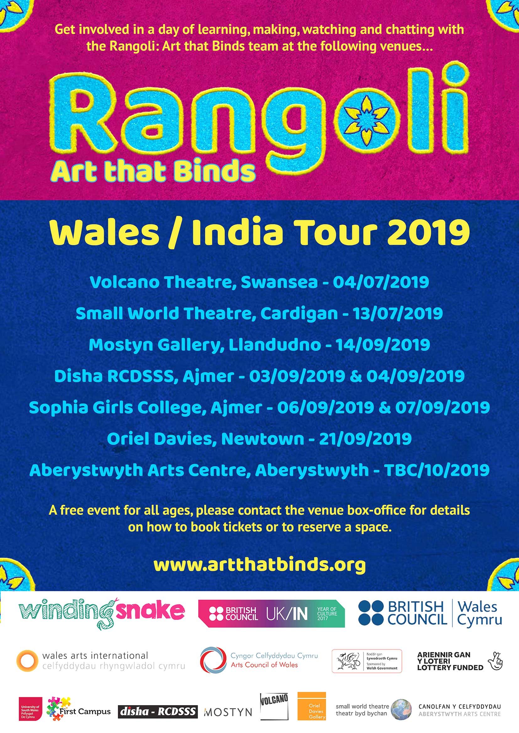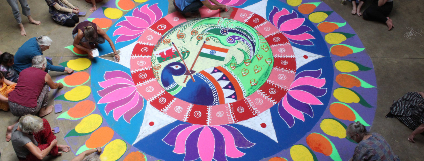 Rangoli: Art that Binds marks Indian independence, art, culture and stories. Winding Snake Productions have worked with Indian and Welsh artists and traveled across Wales and India collecting stories and learning about Rangoli. The project is funded by Wales Arts International and the British Council Wales and has been developed by Amy Morris for Winding Snake Productions.